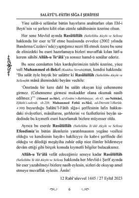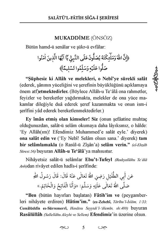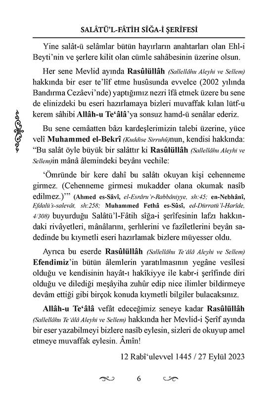 Bu sene cemâatten bâzı kardeşlerimizin talebi üzerine, yüce velî Muhammed el-Bekrî (Kuddise Sirruhû)nun, kendisi hakkında: “Bu salât öyle büyük bir salâttır ki Rasûlüllâh (Sallellâhu Aleyhi ve Sellem)in mânâ âlemindeki beyânı vechile: ‘Ömründe bir kere dahî bu salâtı okuyan kişi cehenneme girmez. (Cehenneme girmesi mukadder olana okumak nasîb edilmez.)’” (Ahmed es-Sâvî, el-Esrâru’r-Rabbâniyye, sh:45; en-Nebhânî, Efdalü’s-salevât, sh:258; Muhammed Fethâ es-Sûsî, ed-Dürratü’l-Harîde, 4/308) buyurduğu Salâtü’l-Fâtih sîğa-i şerîfesinin lafzı hakkındaki rivâyetleri, mânâlarını, şerhlerini ve fazîletlerini beyân sadedinde bu kıymetli eseri hazırlamak bizlere müyesser oldu.