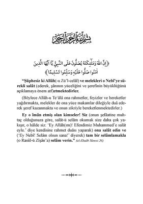 “Şüphesiz ki Allâh ve melekleri, o Nebî’ye sürekli salât (ederek, şânının yüceliğini ve şerefinin büyüklüğünü açıklamaya önem atf)etmektedirler. (Böylece Allâh-u Teâlâ ona rahmetler, feyizler ve bereketler yağdırmakta, melekler de ona yüce makamlar dileğiyle duâ ederek şeref kazanmakta ve onun ism-i şerîfini yâd ederek bereketlenmektedirler.)